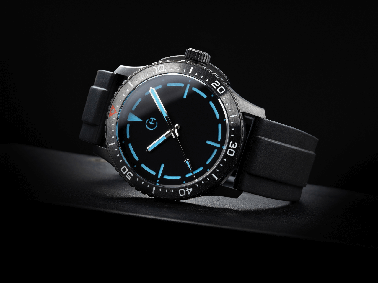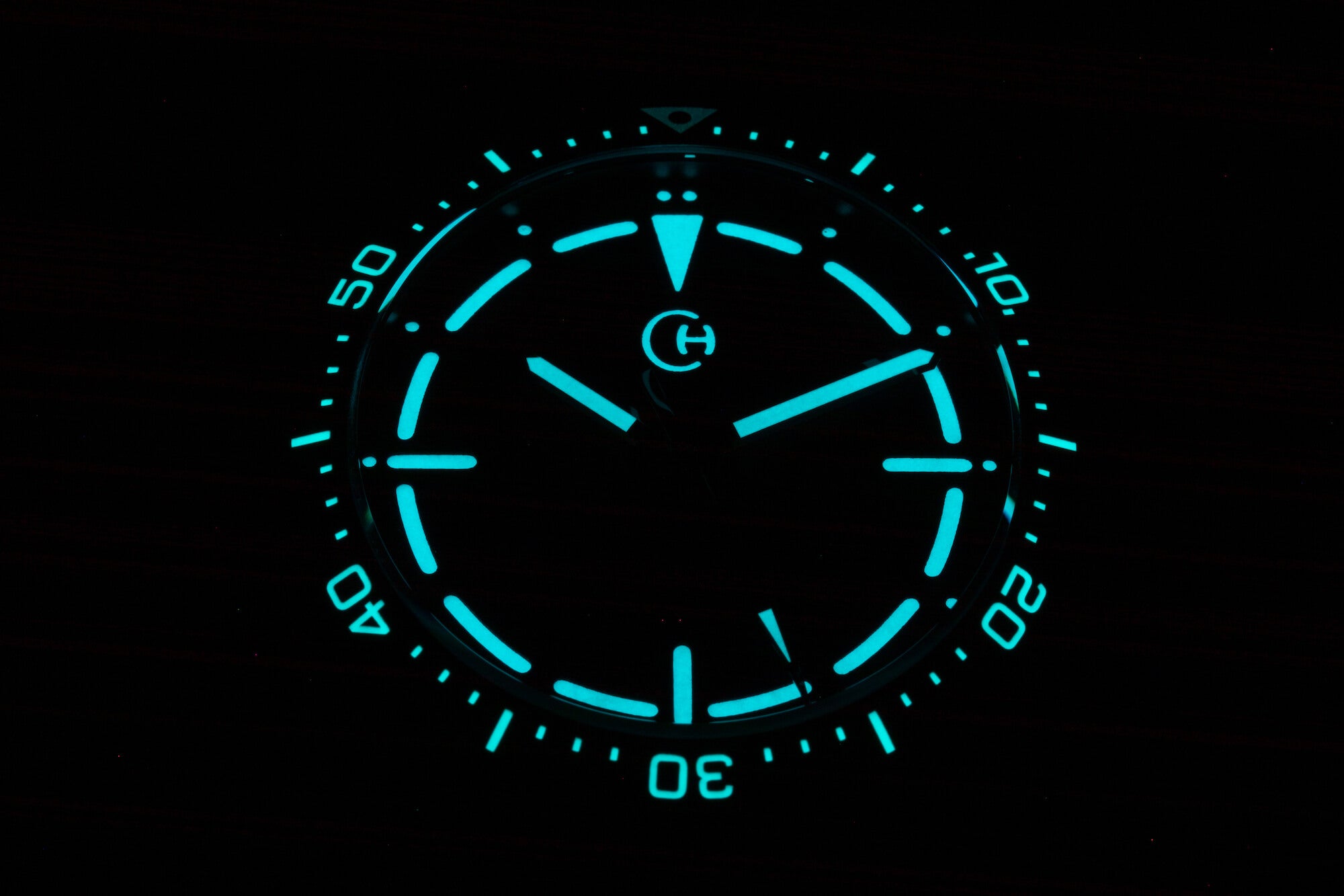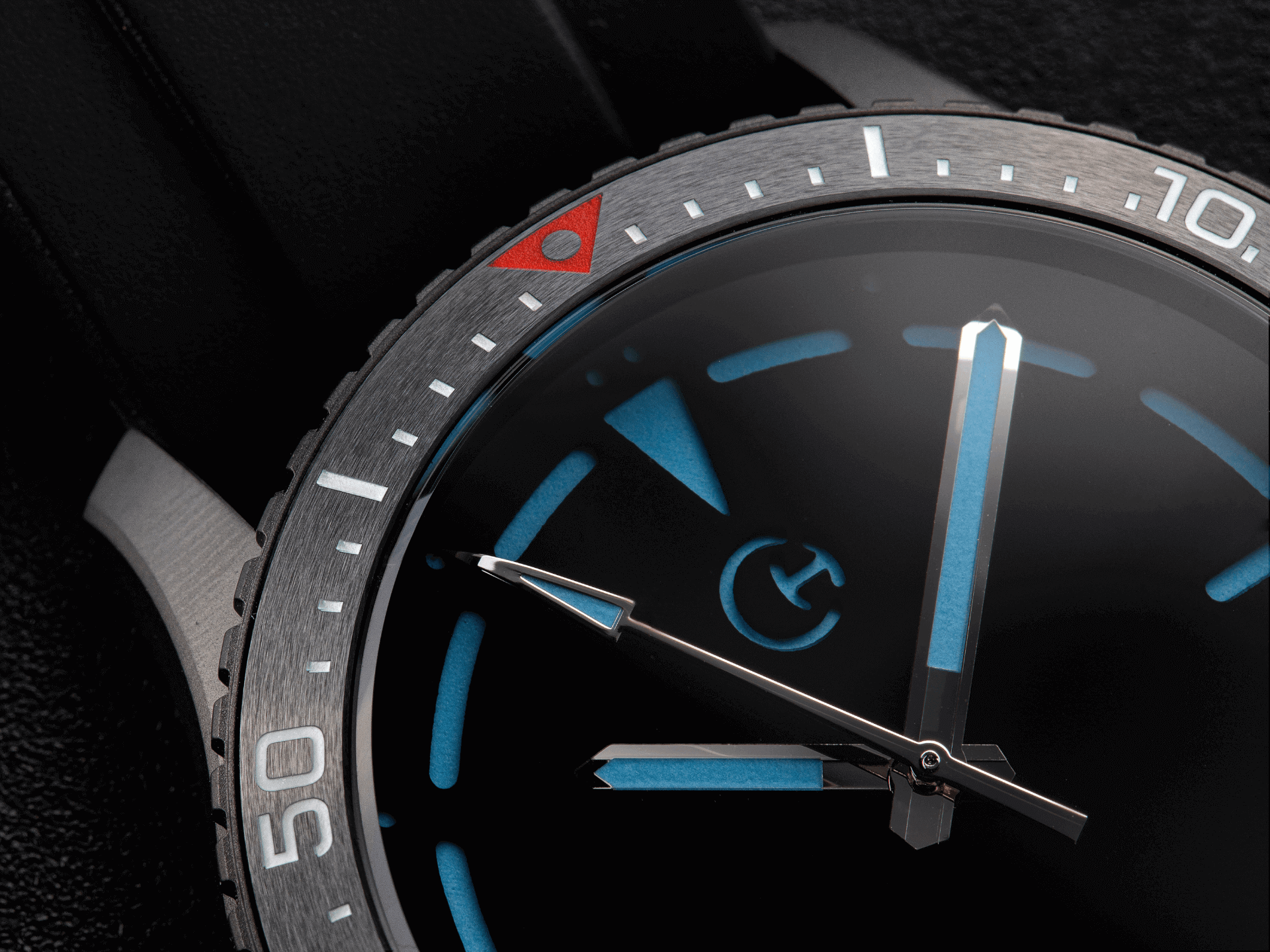The blackest diving watch ever made with a unique time reading experience. A diver watch with water resistance up to 300 meters, a quick-release system for strap replacement, and ultra scratch-resistant sapphire glass. This mechanical men's watch is built for steadfast endurance with a COSC certified Sellita Self-winding movement, watch case from 316L stainless steel and ceramic bezel both with a DLC (diamond-like carbon) sandblasted coating, polished hands, and lower plate of dial filled with Blue 2915c X1 Grade luminescence, which has strong blue glow in the dark. Such grade of luminescence combined with contrasting super black upper dial plate makes your watch to have the most readable watch face ever made.